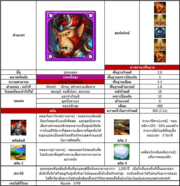 ตารางค่าสถานะต่างๆของซุนหงอคง