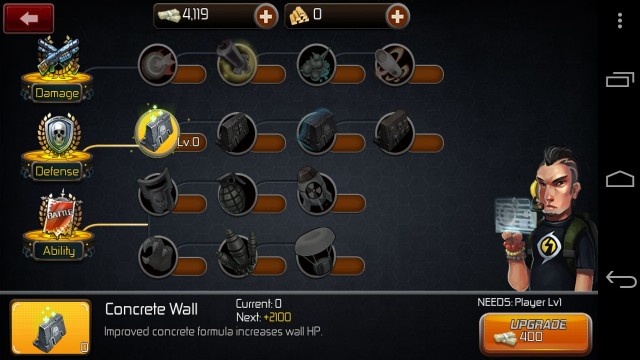 การอัพเกรดเพิ่มความสามารถให้กับตัวฮีโร่และฐานได้ โดยมี 3 ประเภทดังนี้ Damage ,Defense ,Ability จะช่วยสามารถใช้ความสามารถใหม่ๆได้ และยังเพิ่มความแข็งแกร่งให้กับฮีโร่และฐานได้อีกด้วย ซึ่งการจะอัพเกรดความสามารถอื่นๆได้ ต้องทำการอัพกำแพง (Concrete Wall) เสียก่อน จึงจะอัพอย่างอื่นได้ นอกจากนี้ Ability บางอันยังต้องอัพ Ability อื่นๆเป็นทางผ่านเสียก่อน