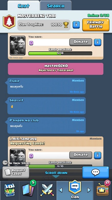 แน่นอนครับระบบกิลด์ยังคงมีอยู่ จะเข้าได้ต่อเมื่อมีเลเวล 3 ขึ้นไป โดยสิทธิพิเศษยังคงเหมือนเกมเดิม ที่สามารถขอการ์ดที่เราต้องการแล้วให้คนในกิลด์ช่วยกันบริจาคได้ หรือเมื่อเราบริจาดให้คนอื่นเราก็จะได้เลเวลและเงินในเกมด้วย และสามารถสู้กันเองกับคนใน Clan ได้ไม่เสียแต้ม ranking ไว้ทดสอบทีมว่าชุดนี้ดีพอหรือไม่