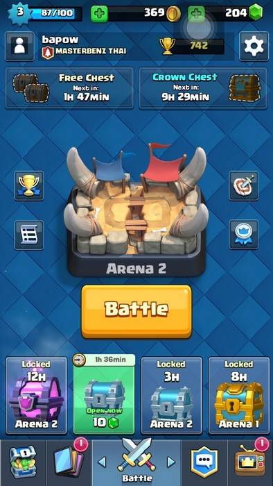 ทุก 3 ชั่วโมงเราจะเปิดกล่องไม้ฟรีได้ 1 ครั้ง และในหนึ่งวันเราจะสามารถเปิดกล่องจากการชนะได้ 1 ครั้ง โดยสะสม 10 มงกุฏ เช่น ชนะ 1 มงกุฏก็จะได้สะสมไปเรื่อยๆ จนครบ 10 จะได้เปิดกล่องทอง 1 ครั้ง ในทุกเกมที่เราชนะ เราจะมีโอกาสได้รับกล่องมาด้วยโดย มี 4 เกรดได้แก่ เงิน ทอง เมจิก และ ซุปเปอร์เมจิก แต่เราจะสามารถเปิดได้ที่ละกล่องเท่านั้น ซึ่งจริงๆ สามารถใช้เพชรในการเปิดได้แต่ไม่แนะนำครับ