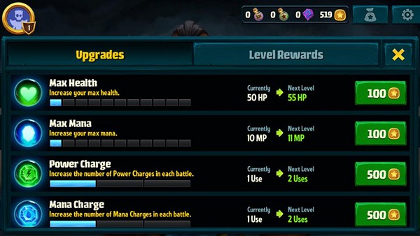 เราสามารถทำการอัพเดทค่าพลังด้านต่างๆ ทั้งพลังโจมตี พลังชีวิต เป็นต้น เกมนี้วัดกันที่สกิล และยูนิท ที่เราสามารถปลดล็อกได้แต่ไม่สามารถจัดวางไว้เลือกใช้ตามใจชอบได้ จะเป็นการสุ่มตามที่มี จึงบอกว่าจริงๆ มันอยู่ที่การวางแผน เทคนิคเฉพาะตัวมากกว่า ที่จะนำชัยชนะมาให้