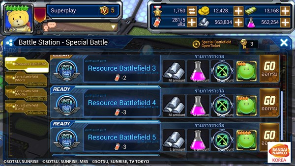 ความสนุกยกที่ 2 สนามรบ Special Battlefield (1-4) เป็นสนามต่อสู้ที่เพิ่มเติมเข้ามาใหม่ จะทำให้เพื่อนๆ สามารถเข้าไปหารางวัลเป็นทรัพยากรที่พิเศษกว่าในสนามรบปกติ เช่น ทรัพยากรหายาก Haro ที่เป็น unit พิเศษสำหรับเพิ่ม EXP จำนวนมากให้กับ MS ที่กินมันเข้าไป