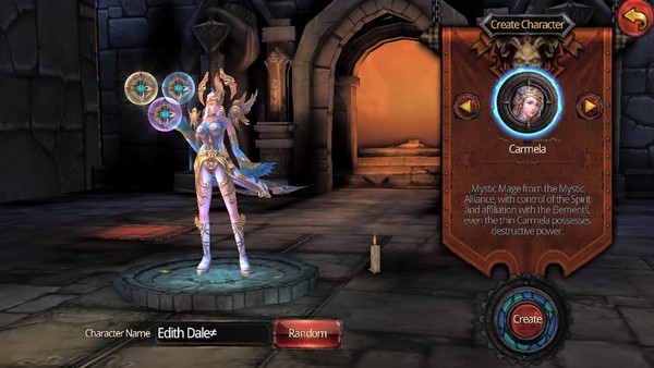 - ตัวละครแรกคือ Carmela เป็นสายอาชีพ Mystic Mage เป็นสายเวทย์ สกิลและท่าไม้ตายก็จะเป็นการใช้พลังเวทย์ในการโจมตี