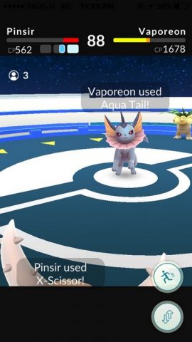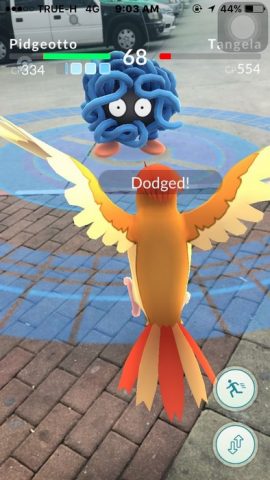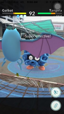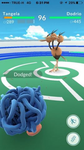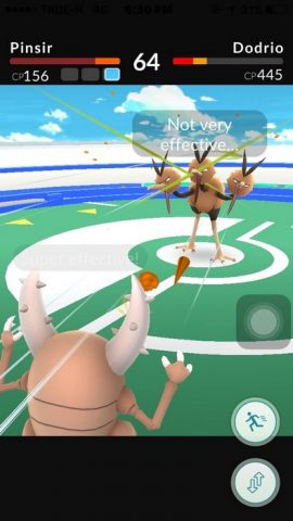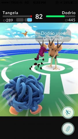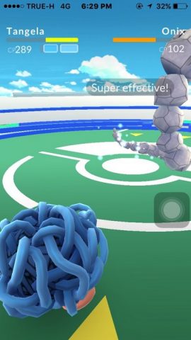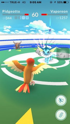 เมื่อเริ่มต่อสู้แล้ว ถ้าเรากดจอธรรมดาจะเป็นการโจมตีธรรมดาและหากสไลด์ซ้ายหรือขวาจะเป็นการกระโดดหลบการโจมตี ซึ่งทำให้เราโดนดาเมจน้อยลงแต่ไม่สามารถหลบได้ทั้งหมด และเมื่อเกจซ้ายบนใต้เลือดของเราเต็ม ให้กดจอค้างไว้จะเป็นการใช้สกิล โดยขณะต่อสู้ให้หลบบไปเรื่อยๆ จนกว่าจะขึ้น Dodged ค่อยโจมตีก็ได้ หรือถ้าไม่คิดอะไรมากก็กดจอรัวๆ แล้วใช้สกิลสวนเลยก็ได้ครับ และเวลาเราโจมตีแล้วชนะธาตุจะขึ้นคำว่า Super effective ถ้าโจมตีเค้าแล้วขึ้นว่า Not very effective แปลว่าไม่ได้ผล ให้เปลี่ยนตัวอื่นโดยกดที่รูปลูกศรขึ้นลงด้านล่างขวา เมื่อเราชนะยิมจะไม่พังลงทันทีแต่เลเวลของยิมจะลดลงและต้องตีซ้ำจนกว่าเลเวลจะหมดจะกลายเป็นยิมเปล่าแล้วเอาตัวของเราลงไปวางได้ทันที (ซึ่งจะมีหลายๆ คนที่ยืนดูแล้วรอฉวยจังหวะนี้แหล่ะ!!)