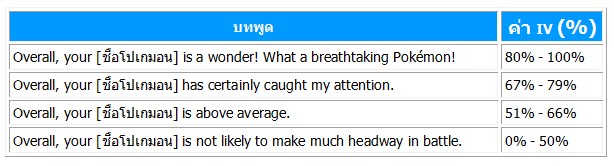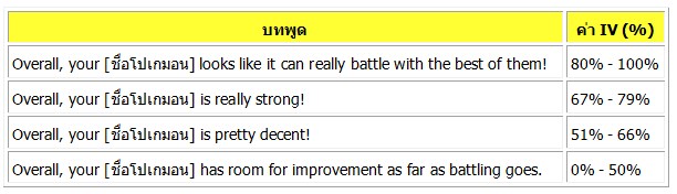 จริงๆ ระบบจะบอกค่าพลังอื่นๆ ที่น่าสนใจอีกแต่ส่วนใหญ่จะเน้นดูกันที่ IV ซึ่งอาจจะไม่ได้วัดค่า IV แบบตรงๆ แต่ก็ช่วยให้เราเลือกได้ง่ายขึ้นว่าจะเก็บตัวไหนหรือเอาตัวไหนไปย่อยได้เยอะอยู่ครับจำแค่ประโยคแรกที่ได้ 80% ขึ้นไปก็พอครับถ้าอยากเช็กเพิ่มว่าตัวไหน IV เท่าไหร่ ปกติใช้เว็บไซด์นี้ในการเช็กลองใช้งานกันดูนะครับไม่แนะนำให้ใช้แอพใดใดลงในเครื่องนะครับเพื่อป้องกันแอพที่มีสปายแวร์ต่างๆ