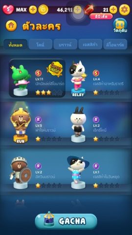แน่นอนตัวละครจาก LINE friend นั้นมีไม่เยอะมาก แต่ว่าแต่ละตัวจะมีคอสตูมที่แตกต่างกันออกไป รวมไปถึงความสามารถต่างๆ อีกด้วย เช่นเริ่มต้นเราจะได้เล่นเป็น Cony โบว์แดง สกิลคือ สะสมเชอรี่ครบ 15 ลูกจะได้คะแนนเพิ่มอีก 50 โดยแต่ละตัวละครจะมีสกิลอยู่ 3 อันโดยจะได้รับเพิ่มเมื่อเราอัพเกรดตัวละครถึงเลเวลที่กำหนด โดยเราจะอัพเกรดตัวละครได้ด้วยเงินในเกมและจะต้องมีวัดถุดิบในการอัพเกรด โดยระบบจะโชว์ที่หน้าตัวละครว่าต้องการอะไรบ้าง