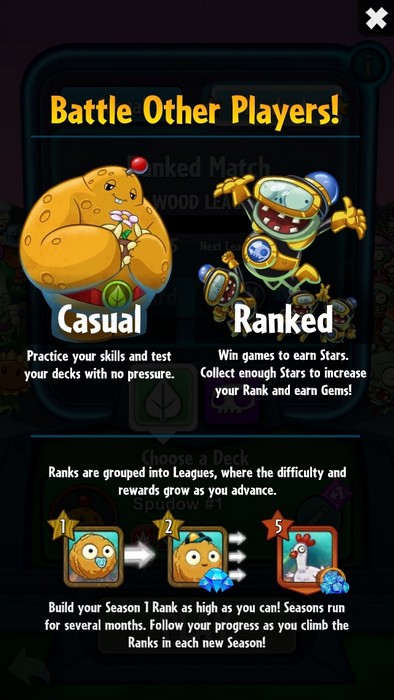 ตัวเกมจะมี 2 โหมดหลัก คือเนื้อเรื่อง(สู้กับคอม) และ Ranking(สู้กับคนในเซิฟเวอร์) ซึ่งตรงนี้แนะนำให้เล่นเนื้อเรื่องเสียก่อนเพื่อทำความรู้จักการ์ดและความสามารถของต้นไม้และซอมบี้เบื้องต้นก่อน เราจะมีเลนอยู่ 5 เลนหลักสำหรับวางต้นไม้หรือซอมบี้ซึ่งพื้นที่ด้านขวาจะเป็นน้ำสำหรับประเภทที่อยู่บนน้ำได้นั้นเอง ต้นไม้และซอมบี้จะมี 3 ค่าที่เราต้องรู้นั้นคือ รูปพระอาทิตคือค่าเรียกใช้ใบนั้นๆ ซึ่งเราจะได้เพิ่มขึ้นทุกเทิรน์เช่นเริ่มที่ 1 เทิรน์ต่อไปจะเป็น 2 เพิ่มไปเรื่อยๆไม่ว่าเราจะใช้หมดหรือไม่ ตัวเลขด้านซ้ายคือพลังโจมตีของตัวนั้นๆ และด้านขวารูปหัวใจคือเลือดของตัวนั้นๆ