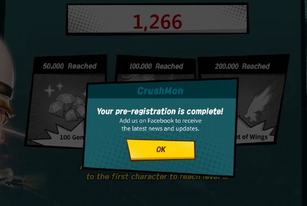 หากมีผู้ลงทะเบียนถึงจำนวนที่กำหนด ก็เตรียมตัวรับไอเทมในเกมฟรีๆไปได้เลยตอนช่วงเปิดเกม หากถึง 50,000 คน ก็จะได้รับ 100 Gem หากถึง 100,000 คน จะได้รับชุดคอสตูม Limited Edition และหากถึง 200,000 คน เตรียมตัวรับเซ็ทปีกไปเลยฟรีๆทันที