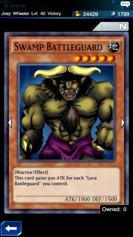 การ์ดนี้จะเพิ่ม Atk 500 ตามจำนวนของ Swamp Battleguard ที่คุณควบคุม