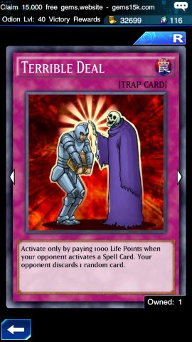 ต้องจ่าย 1000 LP เท่านั้นเพื่อใช้การ์ดนี้ เมื่อศัตรูใช้เวทย์ คู่แข่งต้องทิ้งการ์ดบนมือแบบสุ่ม 1 ใบ
