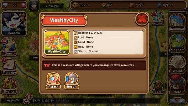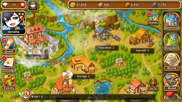 เริ่มต้นมาเกมแนวนี้ ก็จะต้องเริ่มจากการปลูกสิ่งก่อสร้างกันก่อน ทั้งแหล่งผลิตทรัพยากร ฐานฝึกทหาร ตลาด หอสมุด รวมไปถึงพระราชวัง ที่มีตัวละครหลักของเรารับบทเป็นพระราชา แต่พระราชานี้ออกรบไม่ได้นะ ต้องหาแม่ทัพมาออกรบแทน ช่วงแรกเราต้องปลูกสิ่งก่อสร้างต่างๆ พร้อมทั้งอัพเลเวลเมืองตามเควสไปก่อน เพราะต้องเก็บคะแนนระยะหนึ่งถึงจะไปออกรบได้
