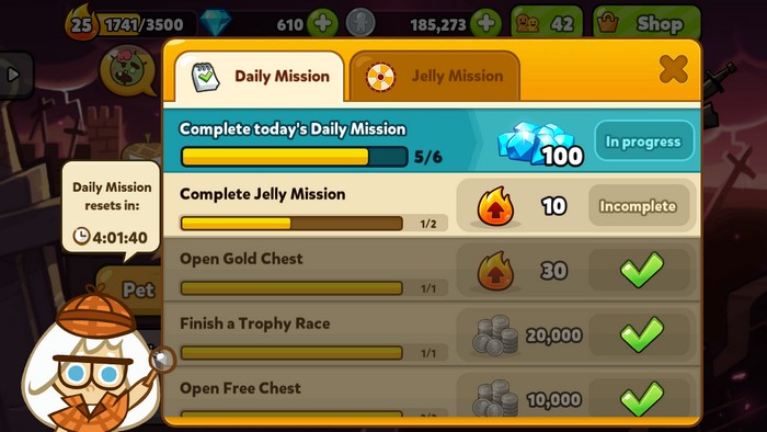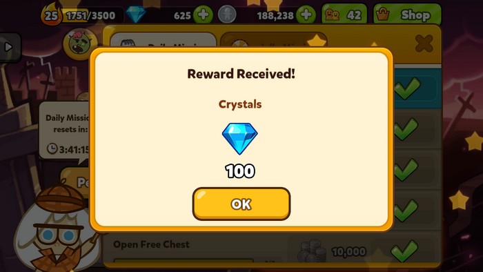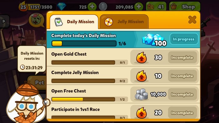 นี้คือระบบใหม่ที่แจกเพชร 100 เม็ด โดยจะมีภารกิจให้เราทำวันละ 6 – 7 อย่าง แต่จะเป็นอันเดิมๆ เช่น กิฟคุกกี้ให้เพื่อน,เข้าเล่นทัวร์นาเม้น,เปิดกล่องทอง,แข่งกับเพื่อน เท่านี้ก็ผ่านภารกิจแล้วครับ เมื่อผ่านครบทั้งหมดเราจะได้แน่ๆเลย คือ EXP เงิน และ คูปองสำหรับช่วยคุกกี้ที่ตกหลุมได้ฟรี 1 ใบ (ปกติ50เพชร) และแน่นอนเมื่อทำครบทั้งหมดจะได้ 100 เพชรทำให้เราอย่างน้อยเราจะลงทัวร์น้าเม้นวันละ 1 – 2 ครั้งแน่นอนแล้วละ ถ้าเราทำไม่เสร็จหรือไม่ได้กดรับเพชรที่ปุ่มด้านบนจะถูกรีเซ็ทจะต้องเริ่มทำใหม่ทั้งหมด เวลา 23.00 ของทุกวัน