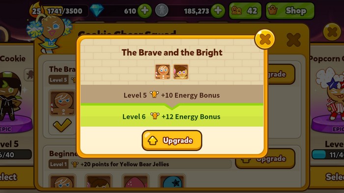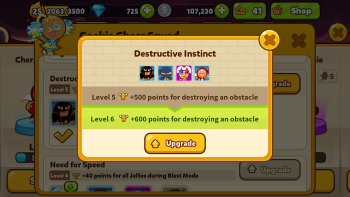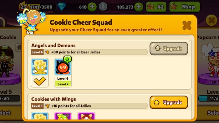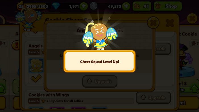 อีกหนึ่งระบบใหม่ที่เพิ่มเข้าระบบจะสามารถเพิ่มความสามารถให้เราได้จากคุกกี้ที่เรามี โดยทำเป็นเซ็ทไว้เช่น ถ้าเรามีคุกกี้ Angles และ Demon ทั้งสองตัวเราจะสามารถกด Upgrade ได้ทำให้เราจะได้แต้มจาก คุกกี้หมีทั้งหมด เพิ่มอีก 80 เป็นต้นถ้าเรายิ่งมี Angles และ Demonเลเวลสูงเท่าไหร่ก็จะยิ่งเพิ่มได้อีก โดยจะสามารถอัพเกรดได้เมื่อคุกกี้ทั้งคู่เลเวลเท่ากัน เล่น Angles เลเวล 4 และ Demonlv 3 เราจะต้องอัพเกรดให้ Demon เป็น 4 ด้วยถึงจะอัพความสามารถของ Cheer Squad ได้ และยังมีเซ็ทของ Pet ให้อัพด้วยทำให้จากสกอร์เก่าที่เราอาจจะสุดที่ 10 ล้านสามารถพุ่งไปถึง 13 ล้าน ทั้งที่วิ่งได้ระยะเท่าเดิมก็ได้ถ้าอัพ Cheer Squad ทั้งหมดซึ่งเอฟเฟตนั้นส่งผลที่ไอดี ไมได้ฟิกว่าจะต้องเอาคุกกี้คู่นั้นมาวิ่งถึงจะได้ผลรับ