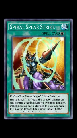 ถ้า “Gaia The Fierce Knight” ,”Swift Gaia the Fierce Knight” หรือ “Gaia the Dragon Champion” ที่คุณควบคุมโจมตี มอนสเตอร์ที่ป้องกัน ,ค่าความต่างของ Atk-Def จากการต่อสู้ จะนำไปหัก LP คู่แข่งด้วย ถ้า “Gaia the Dragon Champion” สร้างความเสียหายได้ในการต่อสู้ด้วยเอฟเฟกนี้ : ได้จั่ว 2 ใบ แล้วทิ้งการ์ดบนมือ 1 ใบ