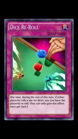 ใช้ได้ครั้งเดียว ,ถ้าผู้เล่นทอย Dice หรือ Die Dice คุณสามารถให้ผู้เล่น(หรือทั้งคู่)ทอยลูกเต๋าใหม่ (คุณสามารถใช้เอฟเฟกนี้ 1 ครั้งต่อเทริน)