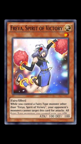 ในขณะที่คุณควบคุมมอนสเตอร์เผ่าแฟรี่ตัวอื่นนอกจาก “Freya, Spirit of Victory” มอนสเตอร์ฝ่ายตรงข้ามไม่สามารถเลือกการ์ดใบนี้เป็นเป้าหมายในการโจตีได้ ,มอนสเตอร์เผ่าแฟรี่ทั้งหมดของคุณเพิ่ม Atk 400