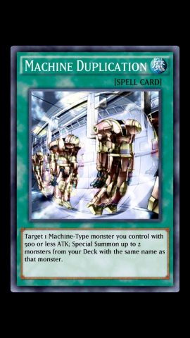 เลือกหุ่ยนต์ที่คุณควบคุม 1 ตัวที่มี Atk 500 หรือต่ำกว่า แล้วอัญเชิญมอนสเตอร์ 2 ตัว ที่ชื่อเหมือนกับมอนสเตอร์ที่เลือก จากใน Deck แบบพิเศษ