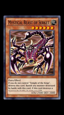 ถ้าคุณไม่ได้ควบคุม “Temple of the Kings” การ์ดนี้จะถูกทำลาย ,แบนมอนสเตอร์ที่ถูกการ์ดนี้ทำลายในการต่อสู้ ,ถ้าการ์ดนี้ทำลายมอนสเตอร์ในการต่อสู้ได้ จะเพิ่ม Atk 500