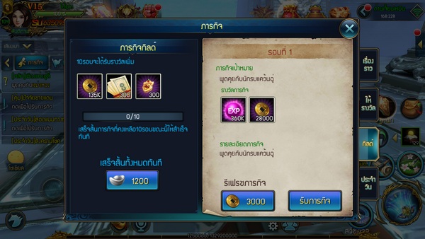 2. ภารกิจกิลด์: ทุกวันในภารกิจ 10 รอบกิลด์ หลังสำเร็จกิจกรรมจะได้รับEXP และผลงานกิลด์ แนะนำผู้เล่นสามารถใช้ตำลึงในการสำเร็จภารกิจ10รอบ หรือสามารถสังหารมอนทีละรอบเพื่อสำเร็จภารกิจได้