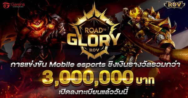 พบกับรายการการแข่งขันสุดยิ่งใหญ่ของเกม RoV สุดยอดเกม MOBA บนมือถือ ที่กระแสแรงที่สุดในขณะนี้ กับการแข่งขัน Road to Glory ซึ่งมียอดเงินรางวัลรวมสูงถึง 3,000,000 บาท เพื่อการันตีความเป็น 1 ในด้านของการแข่งขัน Mobile eSports ที่ใหญ่ที่สุดในประเทศไทย โดยจะเริ่มเปิดการแข่งขันแบบออนไลน์ ตั้งแต่วันที่ 23 พฤษภาคม ตั้งแต่ช่วง 18.00 น. เป็นต้นไป และจะมีการแข่งอย่างต่อเนื่องในทุกๆวัน เพื่อเฟ้นหาสุดยอด 16 ทีม ไปต่อสู้กันต่อในรอบ Group stage แบบ Offline ณ บริษัทการีนา ในวันที่ 10 – 11 มิถุนายน เพื่อหา 8 ทีมสุดท้ายที่จะได้รับสิทธิ์เข้าร่วมการแข่งขันในรอบ Grand Final ที่จะจัดขึ้นที่ ศูนย์การค้าพารากอน ในวันอาทิตย์ที่ 18 มิถุนายน 2560