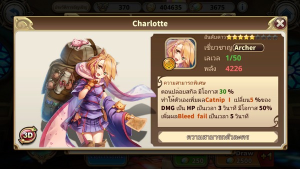 ตัวแรกที่จะนำเสนอมีนามว่า Charlotte เป็นนางฟ้าระดับ 5 ดาว Class Archer ธาตุดิน นางฟ้าตัวนี้มีจุดเด่นอยู่ที่สกิลประจำตัวที่สามารถเปลี่ยนดาเมจที่โดนโจมตีให้กลายเป็น HP ของตัวเองได้ อีกทั้งยังเป็นนางฟ้าที่มีอัตราการโจมตีแบบ Critical ที่สูงมาก เหมาะกับการเป็นตัวดาเมจประจำทีม