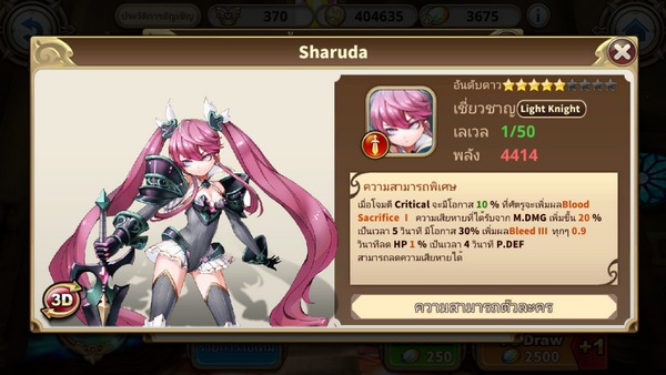 นางฟ้าตัวต่อมาคือ Sharuda เป็นนางฟ้าระดับ 5 ดาวอีกเช่นเคย Class Knight ธาตุไฟ โดยจุดขายของนางฟ้าอัศวินตัวนี้คือเวลาโจมตีจะมีสกิลติดตัวที่จะทำให้ศัตรูติดสถานะเลือดไหล แถมยังโดดเด่นในการสร้างความเสียหายแก่ศัตรูประเภท Ranger ซึ่งเหมาะมากในการ PVP หรือลงดันเจี้ยน