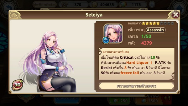 นางฟ้าตัวที่ 3 ได้แก่ Seleiya เป็นนางฟ้ามือสังหารหน้าแบ๊วเป็นอีกตัวที่ได้รับความนิยมมากในเซิร์ฟเวอร์ไทยตอนนี้ อยู่ในระดับ 5 ดาว Class Assassin ธาตุน้ำ ความสามารถพิเศษคือ Attack Speed ที่รวดเร็ว และ มีพลังโจมตีที่สูงมากเหมาะกับทุกสถานการณ์ไม่ว่าจะเป็นการล่าบอส , PVP หรือลงดันเจี้ยนได้หมด เรียกได้ว่าเป็นนางฟ้าที่ฮอตที่สุดในชั่วโมงนี้เลยก็ว่าได้
