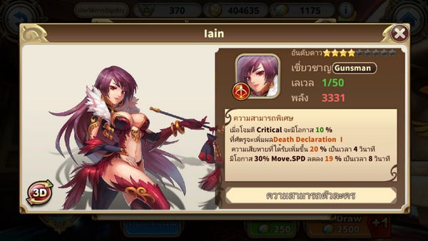 มาถึงนางฟ้าตัวสุดท้ายได้แก่ Lain ตัวนี้เป็นนางฟ้าระดับแค่ 4 ดาวเท่านั้น Class Gunsman ธาตุไฟ ถึงนางฟ้าตัวนี้จะเริ่มต้นแค่ 4 ดาว แต่ความพิเศษของเธอนั้นคือความสมดุลทั้งพลังโจมตี และ ป้องกัน แถมด้วยสกิลที่ทำให้ศัตรูติดสถานะเลือดไหลแบบ Sharuda แต่แรงกว่ามาก และ สกิลลด Move Speed ของศัตรูซึ่งทำให้นางฟ้าตัวนี้เหมาะมากในการ PVP เวลาที่ต้องเจอกับศัตรูที่เก่งในระยะประชิด