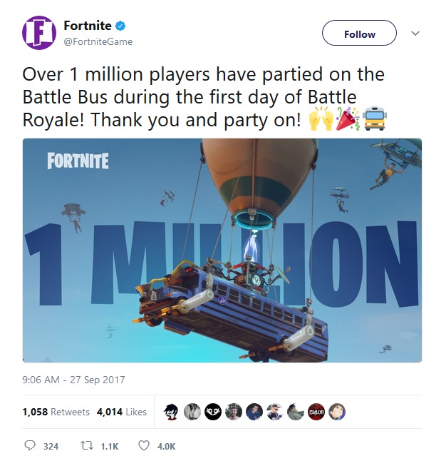 source: Fortnite: Battle Royal F2P Launch Gets Over 1 Million Players in the First Day