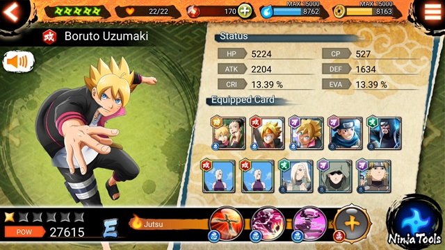 การ์ดตัวละครในเกมนี้จะช่วยเพิ่มค่าสเตตัสให้กับตัวละคร ทั้งพลังโจมตี , ป้องกัน และเลือด โดยนินจาแต่ละคนนั้นจะมีธาตุสีต่างกัน หากคนเล่นเอาการ์ดที่สีหรือตัวละครตรงกันมาใส่ ก็จะทำให้ค่าสเตตัสของตัวละครนั้นตัวเพิ่มขึ้นเป็นทวีคูณเลย ง่ายๆ ว่า เกมนี้ตัวละครไม่ได้กาชา แต่การ์ดเพิ่มสเตตัสนั้นจะเป็นกาชา และแน่นอนว่ามีการแบ่งเกรดเรียบร้อย แต่ก็แปลว่าข้อดีคือคนเล่นจะยังสามารถเข้าถึงตัวละครได้ทุกตัวนั่นเอง