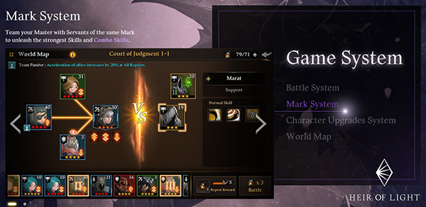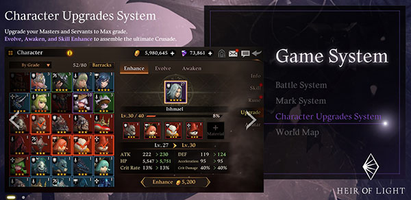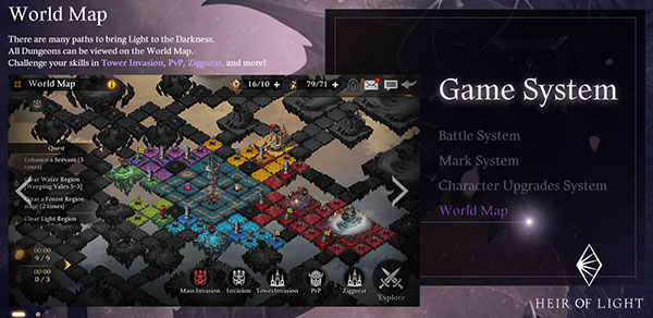 ความแตกต่างของ Heir of Light คือเราจะต้องใส่รูนหลากหลายประเภทให้กับตัวละครของเรา สร้างทีมที่แข็งแกร่ง และสามารถผสมผสานสกิลของสมาชิกในทีมได้ด้วย! แผนที่ภายในเกมมีความแตกต่างและน่าค้นหาไม่น้อย