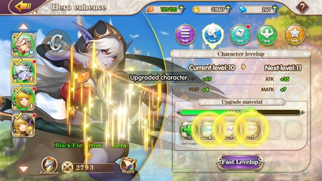 ในการเล่นเกมนั้น คนเล่นจะสามารถปลดล็อคตัวละครมาเล่นได้เรื่อยๆ อยู่แล้ว (แต่เกมก็ยังมีกาชามาให้กดสุ่มเหมือนดั่งเช่นเกมอื่นๆ) แต่วิธีการพัฒนาตัวละครนั้นจะไม่เหมือนเกมอื่นตรงที่ว่าเกมนี้จะไม่มีการใช้ระบบการ์ดตัวละครสังเวย แต่เป็นการใช้การ์ด EXP ในการปั้มเลเวลเอา ซึ่งก็สามารถหาได้จากการเล่นด่านปกติเช่นเดียวกัน