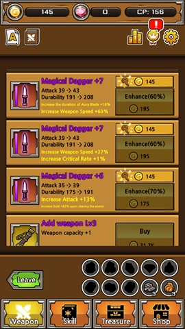จะสังเกตได้ว่าองค์ประกอบของเกมนี้จะเหมือนกับเกมแนว IDLE เลยก็คือ ใช้เงินเป็นตัวแปรหลักของทถุกอย่าง ไม่ว่าจะเป็นการสร้างอาวุธหรือการตีบวกอาวุธ และทุกครั้งที่ผ่านทุกๆ ชั้นที่ 20 ก็จะได้รับเงินรางวัลมาตอบแทนอีกด้วย เรียกได้ว่าสะสมปั้มเงินกันได้เรื่อยๆ เลยล่ะครับ เพียงแต่ว่านอกจากว่าเงินจะเป็นปัจจัยสำคัญแล้ว คนเล่นจะต้องไปเก็บวัตดุดิบในการสร้างอาวุธอีกด้วย