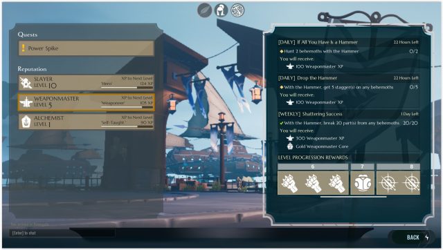 เมือผ่านจนไปถึงเกาะที่ 2 เราจะได้รับระดับ Weapon Master LV 1 ให้กดปุ่ม [J] เพื่อดูเควส Weapon Master โดยจะแยกเป็นเควสประจำวันและเควสประจำสัปดาห์ การเพิ่มระบบ Weapon Master มาจากการทำเควสของ Weapon Master โดยเฉพาะ และการสร้าง-อัพเกรดอาวุธ ดังนั้นเมื่อได้รับ Weapon Master มาแล้วรีบทำเควสซะ เพื่อที่จะได้ปลดล็อคอาวุธใหม่และยังได้รับ Cell เพิ่มอีกด้วย