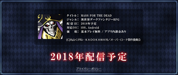 Overlord: Mass for the Dead แม้จะมีการเปิดให้ลงทะเบียนล่วงหน้ากันแล้ว แต่ข้อมูลของตัวเกมส์กลับมีการเปิดเผยออกมาน้อยมากๆ ซึ่งตอนนี้มีเพียงข้อมูลว่าตัวเกมส์จะเปิดให้บริการบนมือถือทั้ง iOS และ Android ซึ่งจะมีระบบการเล่นหลักของตัวเกมส์เป็น MMORPG ซึ่งจะออกมาในรูปแบบไหนก็ยังไม่มีตัวอย่างให้เราเห็น แต่แค่คิดว่าจะได้เข้าไปลุยในโลกของท่านลอร์ด Ainz Ooal Gown ที่น่าหลงไหลก็ทำให้รู้สึกตื่นเต้นได้ไม่น้อยเเล้ว ใครสนใจรายละเอียดเพิ่มเติมก็ลองเข้าไปเยี่ยมชมกันได้ที่ https://overlord-game.com/