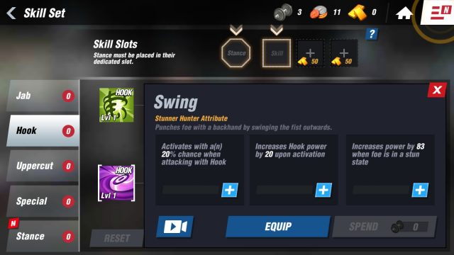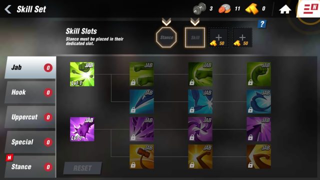 การติดตั้งสกิลให้ไปที่ Skill Set โดยเราสามารถติดตั้ง Skill ได้ 2 ช่อง มากกว่านี้ต้องจ่าย Gold แต่เมื่อเล่นไปเรื่อยๆจะได้รับ Gold มาเอง แนะนำให้เปิดล็อคให้ติดตั้ง Skill ได้ทั้ง 4 ช่อง แต่อย่าลืมว่า Skill จะแยกสายตามท่าชก หากเราใช้ Skill เฉพาะบางท่า ท่าชกอื่นๆของเราจะเบาลง เพราะไม่มี Skill เสริม