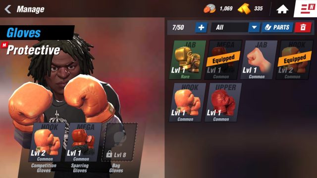 Gear เป็นอีกอย่างที่เราควรให้ความสำคัญ ซึ่งจะใส่ได้ทั้งหมด 5 ชิ้น ทั้งนวม ,ฟันยาง ,กระจับ สามารถอัพเกรดเพิ่มพลัง และเพิ่ม สำหรับท่าไม้ตายต่างๆก็มาจากนวมนี่แหละ (หาเก็บเอาจาก Story) สำหรับอุปกรณ์อื่นๆหาจากใน League และแน่นอน อุปกรณ์แต่ละอย่างจะเพิ่มพลังให้แค่บางท่าชกเท่านั้น