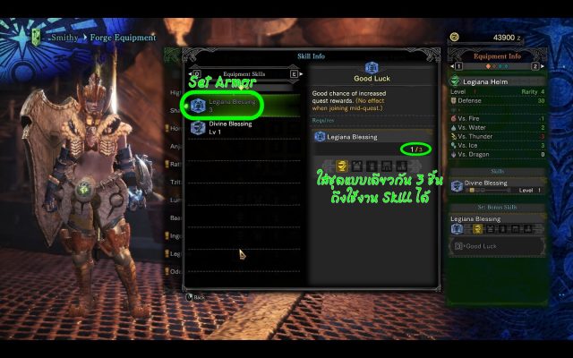 สำหรับวิธีดูคำอธิบาย Skill เมื่ออยู่ในร้านชุดเกราะ สามารถกดปุ่ม R3 หรือ Tab เพื่อดูรายละเอียดของชุดว่ามี Skill อะไรบ้าง หากชุดเกราะนี้มี Skill Set Armor จะมีเขียนไว้ว่าต้องใส่ชุดเกราะชุดเดียวกันกี่ชิ้น (มีแค่บางชุดเท่านั้นที่มี Set Armor) แต่ Skill บางอย่างของ Set Armor สามารถแทนได้ด้วยเพชร ซึ่งเล่นไปซักพักก็จะได้เองไม่ต้องเป็นห่วง