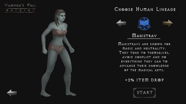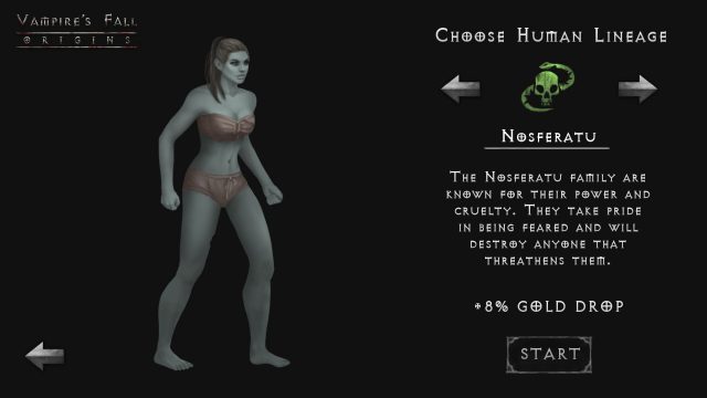 เริ่มเกมมาเราจะสามารถสร้างตัวละครที่ปรับแต่งหน้าตาได้ และเลือกเชื้อสายของตัวเองเพื่อรับความสามารถพิเศษ ได้แก่ Nosferatu (ได้ความสามารถ +8% Gold Drop) , Magistrav (ได้ความสามารถ +2% Item Drop) , Ranjeni (ได้ความสามารถ +2% dodge) เราสามารถเลือกได้เลยเพราะทุกตัวละครเหมือนกันต่างกันแค่ความสามารถพิเศษของเชื้อสาย