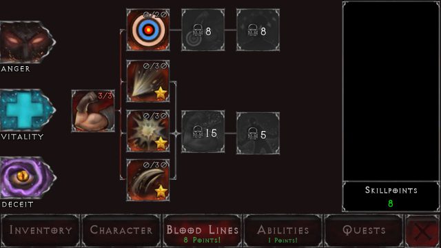 สำหรับการใช้สกิล สามารถเลือกได้ 2 แบบคือ สาย Control สาย Instinct ซึ่งจะปลดล็อคเมื่อเราได้กลายเป็นแวมไพร์ไปแล้ว ในช่วงแรกแนะนำให้อัพสกิลดูดเลือดไว้ก่อน เพราะจะช่วยได้มาก สำหรับสกิลด้านอื่นแนะนำให้เลือกอัพตรงตามสายอาวุธที่ถนัด เช่นสาย ฟัน แทง ทุบ จะทำให้โจมตีได้แรงขึ้น