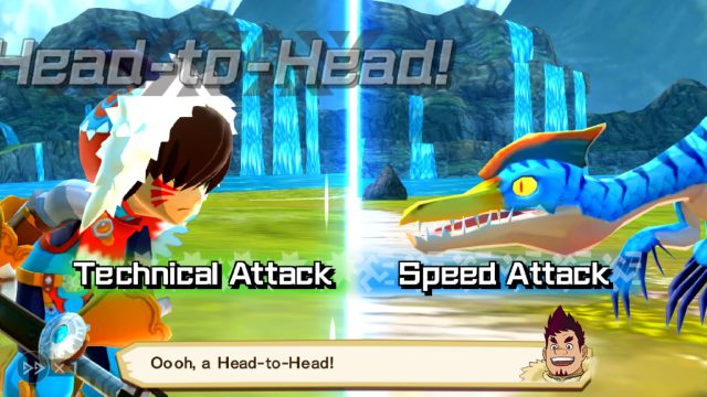 การต่อสู้ จะเป็นแบบ Turn base โดยเราจะบังคับได้เฉพาะตัวละครตัวเองในการต่อสู้ได้เท่านั้น (มอนสเตอร์คู่หูจะโจมตีอัตโนมัติ) เมื่อเลือกคำสั่งโจมตีจะให้เลือกท่า Power-Speed-Technical โดยท่าต่างๆนี้จะแพ้ชนะกันแบบเป่ายิ้งฉุบ ดังนี้ Power>Technical>Speed> Power หากเราเลือกท่าชนะทางกัน จะโจมตีได้หนักขึ้น โดนโจมตีเบา และได้รับ แต้ม Kinship มากขึ้น นอกจากนี้หากเราชนะทางได้ติดกัน 3 ครั้ง จะทำให้มอนสเตอร์ล้มและได้โจมตีฟรี 1 เทิร์น