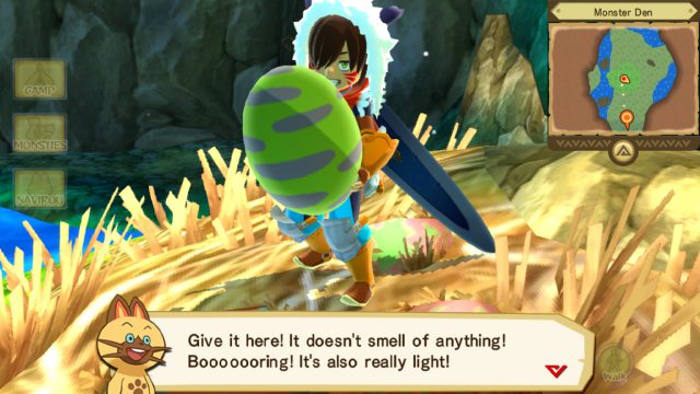 การหาไข่และการฟักไข่ การหามอนสเตอร์คู่หู หาได้จากการนำไข่มาฟักที่หมู่บ้าน จาก Monster Den (ถ้ำตามแผนที่) ด้านในสุดของ Monster Den จะมีรังไข่อยู่ เราสามารถนำมาเข้าไปหาไข่ได้ โดยเจ้าเหมียวเพื่อนยากจะคอยบอกว่าไข่ใบนี้มีน้ำหนักและกลิ่นเป็นยังไง (ยิ่งกลิ่นดี และไข่มีน้ำหนักมาก จะมอนสเตอร์จะยิ่งเก่ง)