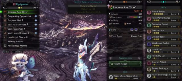 Switch Axe สายดูดเลือด ใช้การ Augment แบบ Health Regen พร้อมกับใส่ชุดเซตของ Vaal Hazak เพิ่มความสามารถด้าน Regen เพิ่มเข้าไปอีกเพื่อคอมโบกับสกิล Peak Performance (เพิ่ม atk เมื่อ HP เต็ม) และยังใช้ Power Prolonger เพื่อให้เกจน้ำยาอยู่ได้นานขึ้น แต่เกราะและอาวุธในรูปยังไม่เข้า PC (เกราะและอาวุธของ Lunastra ) ดังนั้นอาจจะต้องเปลี่ยนไปใช้อันอื่นก่อน