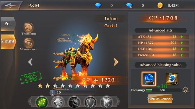 บทบาทของคนเล่นก็คือการมีส่วนร่วมในการพัฒนาตัวละคร คนเล่นจะสามารถอัพเกรดสัตว์ขี่ คู่หู อาวุธ เพื่อให้ตัวละครมีความแข็งแกร่งมากยิ่งขึ้่น เกมนี้ยังมีระบบสืบทอดพลัง ที่หากคนเล่นเปลี่ยนอาวุธหรืออุปกรณ์ใหม่ ก็จะย้ายพลังไปใส่ในอาวุธใหม่ได้โดยไม่ต้องตีบวกใหม่อีกด้วย