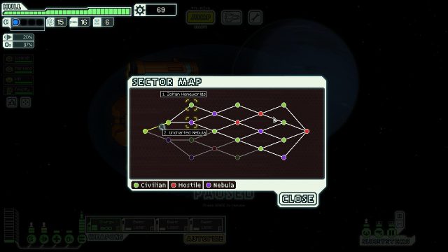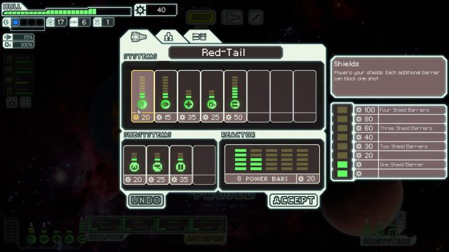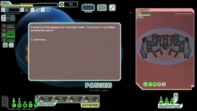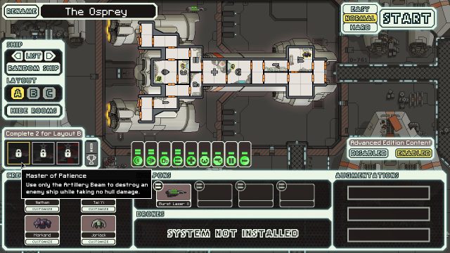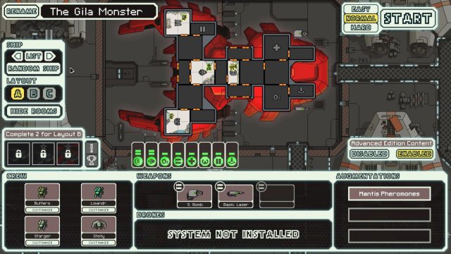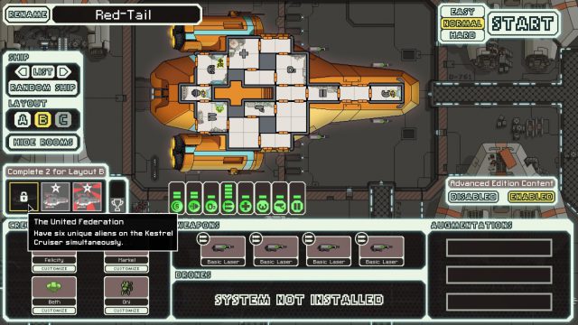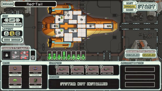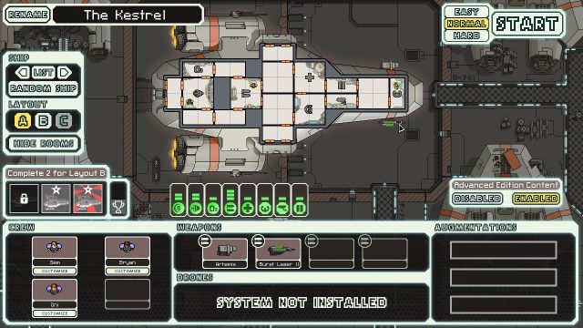 ก่อนเริ่มเกมเราจะได้เลือกยานออกเดินทาง 1 ลำ ซึ่งยานแต่ละลำก็จะมีการติดตั้งอาวุธ ,คนขับ ,ระบบของยานแตกต่างกันไป แต่ในช่วงเริ่มต้นแนะนำยาน The Kestrel ที่เป็นยานมาตรฐานก่อนเพราะเล่นง่ายสุด