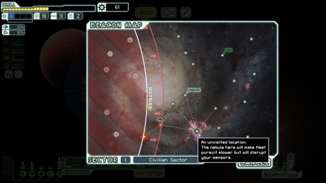จุดหมายของเราคือจุด Exit โดยเรามีเวลาเพียง 3 เทิร์นเท่านั้นก่อนที่พวกกบฏจะไล่ตามเรามา โดยดูจากเส้นคาดคะเนระยะทางของกบฏ ให้เรารีบเดินทางก่อนที่มันจะตามเราทัน แต่ควรสำรวจตามจุดต่างๆเพื่อเก็บเงินอัพยานให้มากที่สุดก่อนเดินทางไปยังดาวต่อไป