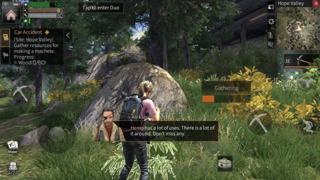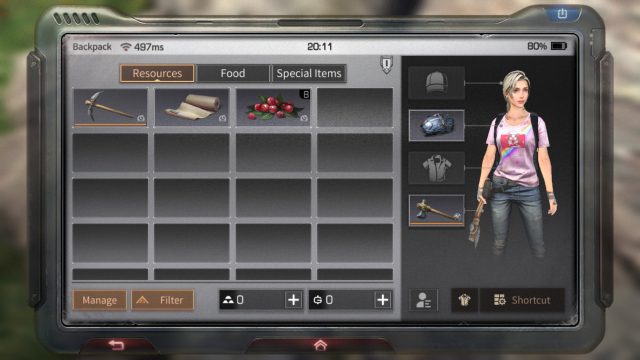 ในช่วงแรกของโหมด Tutorial หรือเนื้อเรื่องบทนำนี้ จะให้เรารู้จักกับทรัพยากรต่างๆ โดยสามารถเก็บผลไม้ป่าและเมล็ด ตามต้นไม้หรือพุ่มหญ้าได้ โดยเมล็ดสามารถนำไปปลูกได้ที่สวน และสำหรับการหาไม้จะต้องใช้ขวานมาสับต้นไม้ และแร่ต้องติดตั้งอีเต้อก่อน จึงจะสามารถขุดแร่ได้ โดยจะต้องติดตั้งอุปกรณ์เหล่านี้ไว้ที่ช่องอาวุธเสียก่อน จึงทำการเก็บทรัพยากรได้