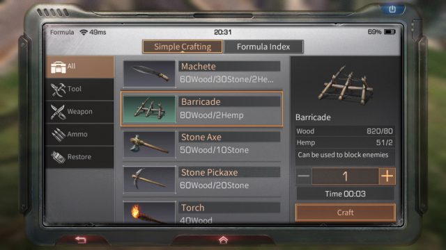 การคราฟอุปกรณ์สามารถคราฟได้จากปุ่ม Make ซึ่งจะสามารถคราฟ อุปกรณ์พื้นฐานได้เช่น ขวาน ,อีเต้อ ,มีด ,คบเพลิง หรือธนู หากต้องการคราฟอุปกรณ์ระดับสูงกว่านี้จำเป็นต้องมีบ้านและโต๊ะงานสำหรับการคราฟอุปกรณ์โดยเฉพาะ นอกจากนี้อุปกรณ์จำพวกรั้วต่อต้านซอมบี้ Barricade ก็ยังสามารถคราฟได้จากปุ่ม Make นี้ด้วย โดยติดตั้ง Barricade ไว้ที่ช่องอาวุธแล้วจึงติดตั้งที่พื้นได้ ซึ่งเป็นหนึ่งในภารกิจของโหมดฝึกฝนเช่นเดียวกัน