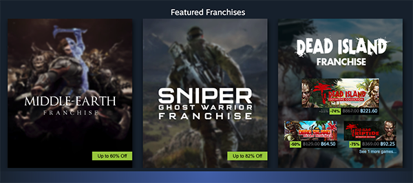 ก็จะมีเกมแฟรนไชส์น่าสนใจหลายเกมเช่นกัน ตัวอย่างเช่น Dead Island, Sniper Ghost Warrior, Middle-Earth, Divinity Original Sin เป็นต้น