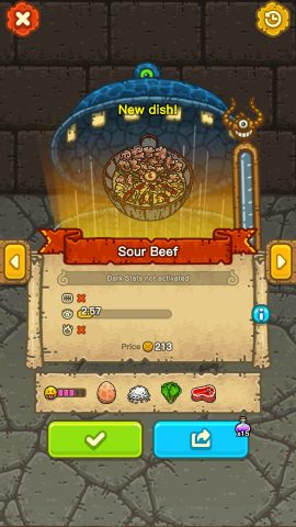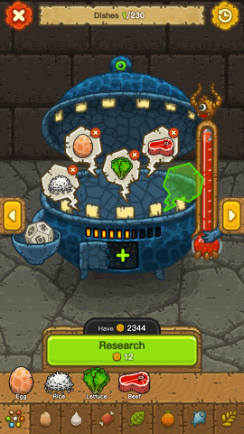จากนั้นมาถึงขั้นตอนการคิดค้นเมนูใหม่ๆ เราจะต้องนำวัตถุดิบที่ได้จากฟาร์มาโยนลงไหสารพัดประโยชน์ เอ้ย! หม้อปรุงสูตร Dishes โดยวัตถุดิบจะให้พลังความเข้มข้นที่ต่างกัน โดยดูจากหลอดสีแดงทางด้านขวา หากเกจของหลอดแดงเกิน 8 ใน 10 จึงจะสามารถปรุงได้ เมื่อปรุงสำเร็จเราจะได้รับเมนูใหม่ๆขึ้นมา *แต่หากได้เมนูเดิมจะเปลี่ยนสูตรใหม่ซึ่งอาจจะใช้วัตถุดิบที่น้อยลง หรือรสชาติที่ดีขึ้น